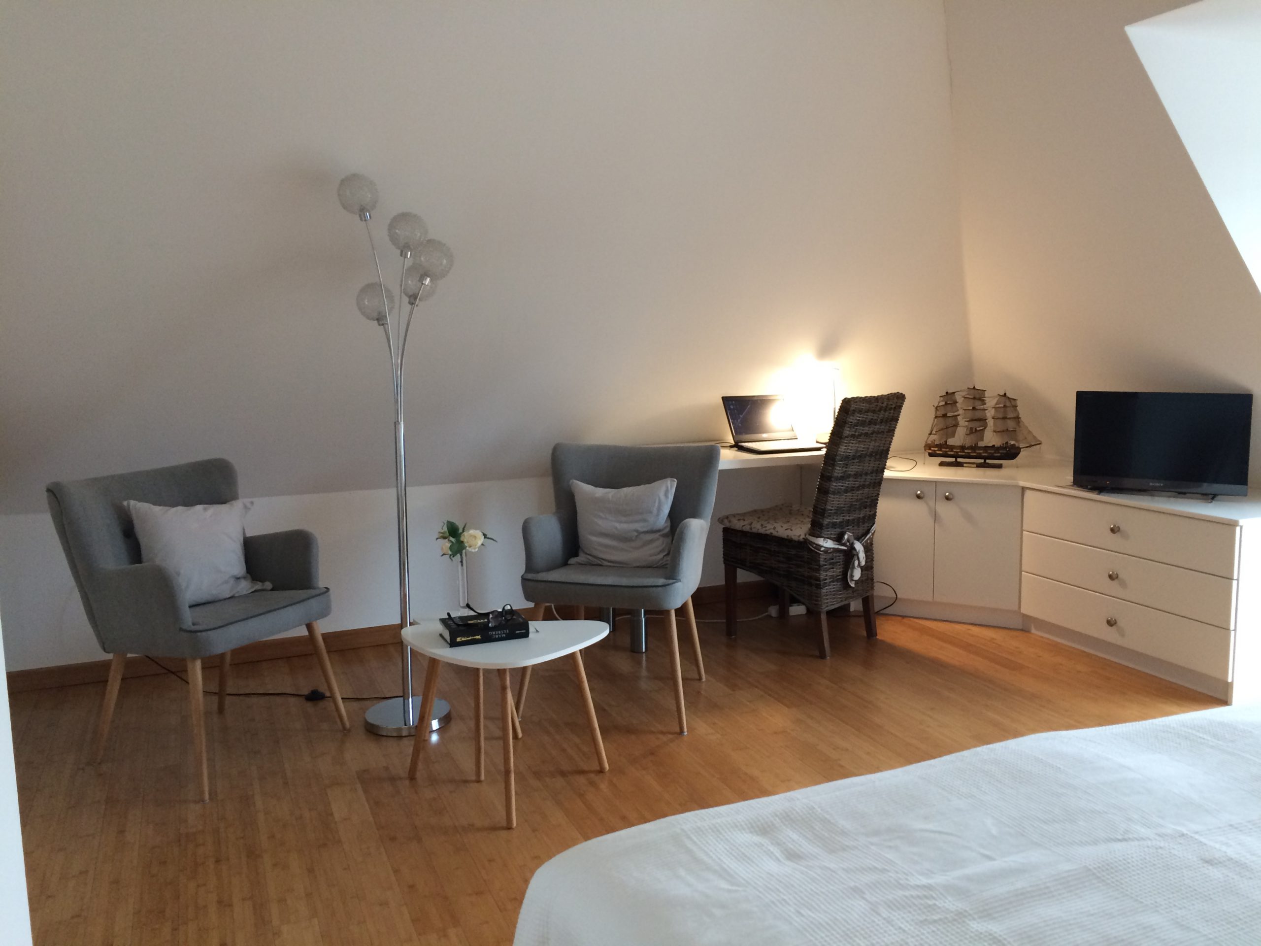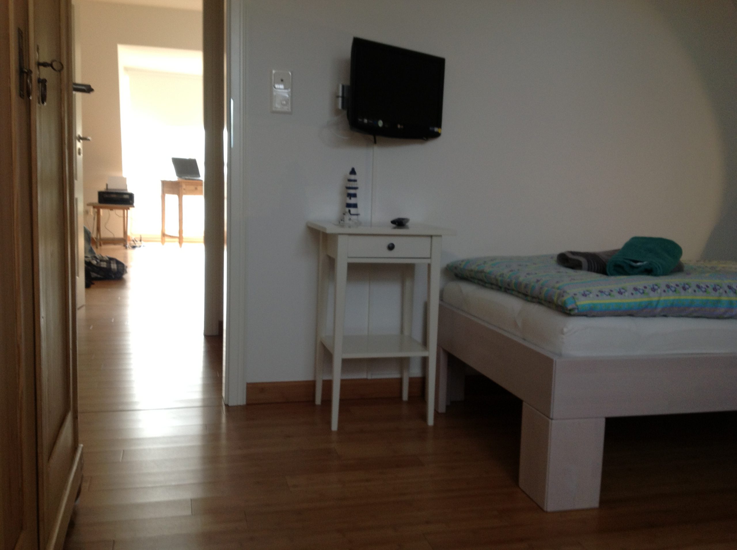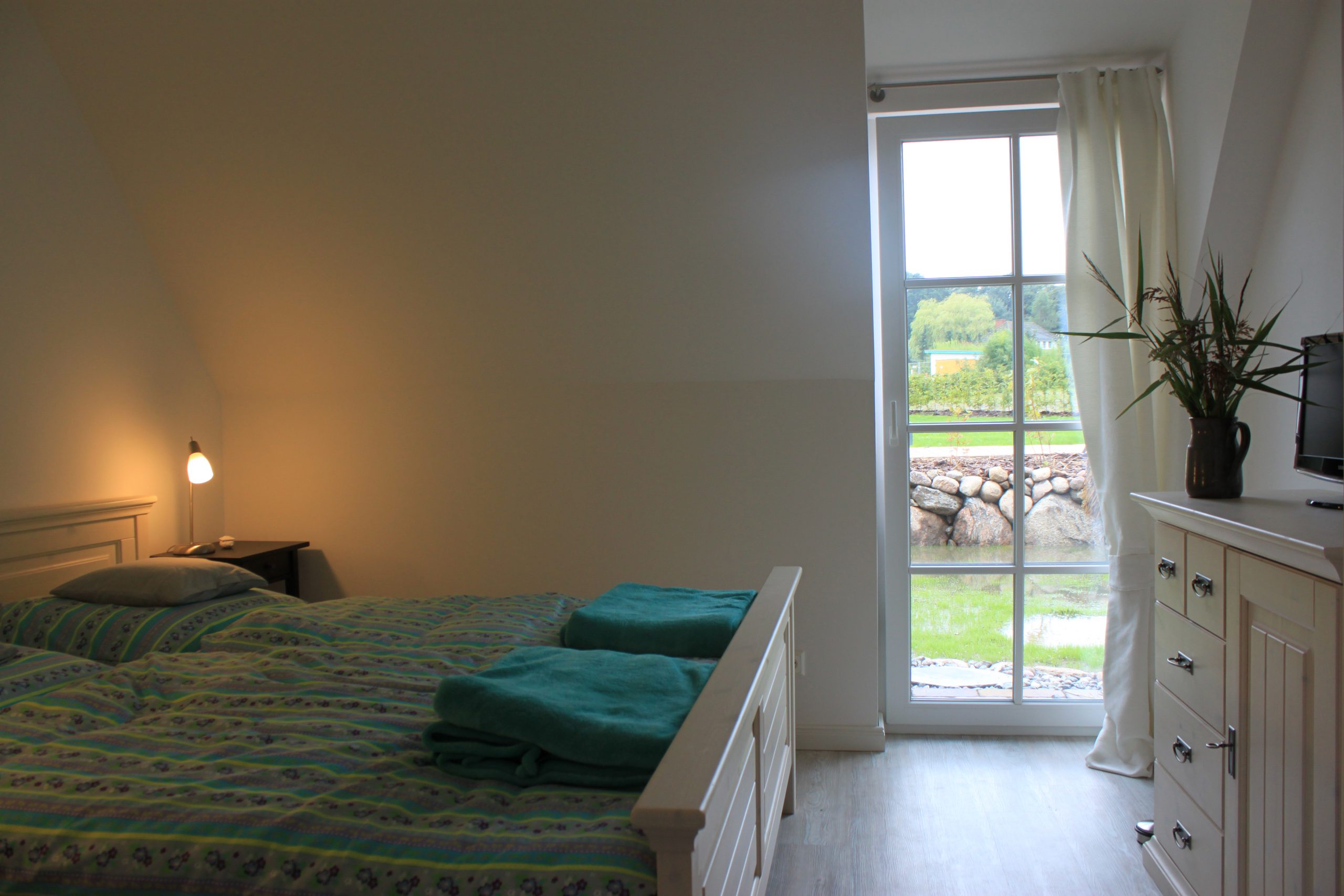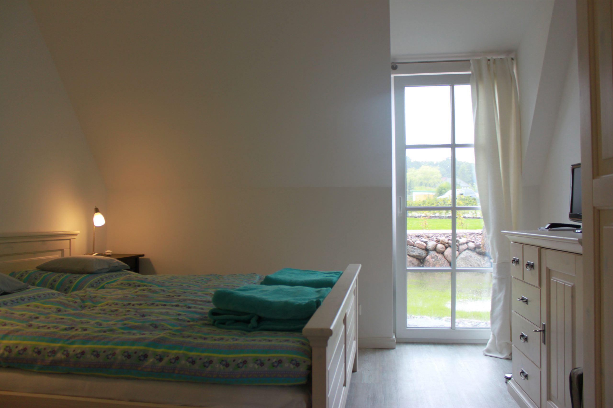Das Haus ist so eingerichtet, dass 6 Personen und 1-2 Kleinkinder zusammen sein können und sich doch jeder in seinen Bereich zurück ziehen kann. Jeder Raum ist mit einem Flachbildschirm und gemütlichen Sitzgelegenheiten ausgestattet. Das „Gartenzimmer“ im Erdgeschoss hat einen direkten Zugang zu Garten und Terrasse. Das Familienzimmer im Obergeschoss verfügt über einen großen Balkon mit Blick auf das Achterwasser, 2 moderne und gemütliche Sessel, einen kleinen Schreibtisch und einem Kinderbettchen, das Schlafzimmer daneben verfügt über zwei Einzelbetten, die auch zusammen gestellt werden können.